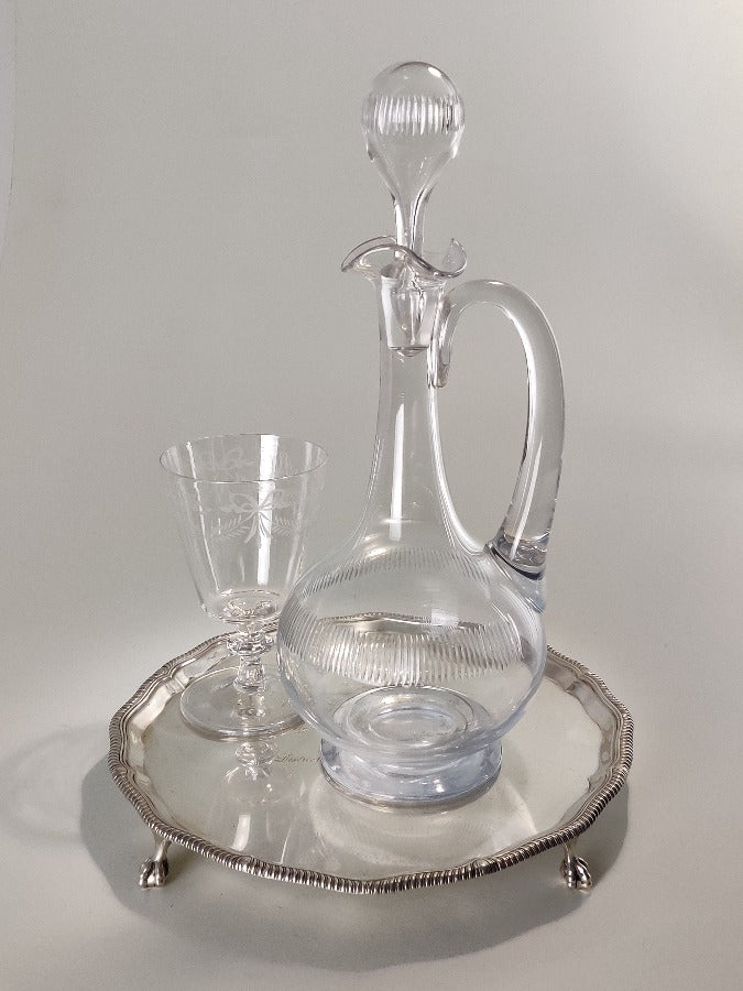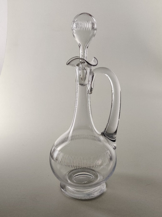 A very stylish claret jug, beautifully light and elegant in design. The stopper has the same cut as the decanter but also the unusual feature of a tear inclusion within the stopper which is very effective. Good ground pontil to the base, no chips or cracks it does have a slight ring inside the decanter due to use, it is difficult to see and it is near the bottom and does not detract.