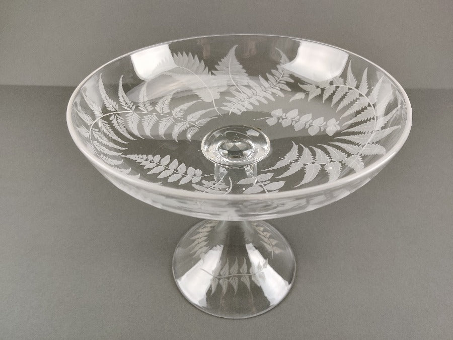 A very pretty 19th century engraved glass Comport/Tazza. The naturalistic fern engravings on this piece are stunning. In good condition with no chips or cracks, this would make an amazing centrepiece.